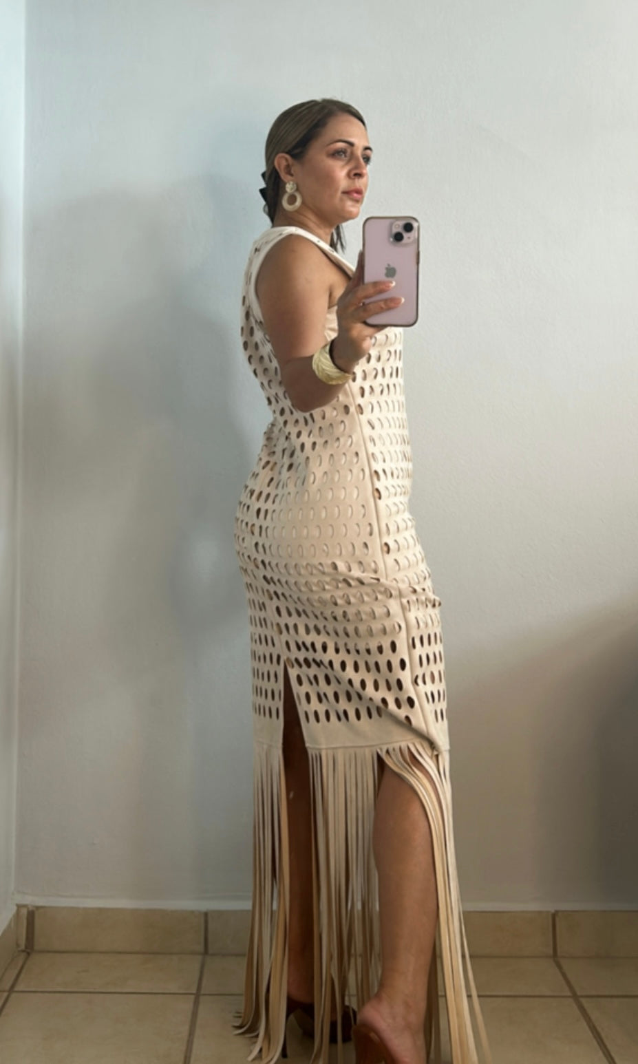 Sleeveless fringe maxi dress allover cutouts fringe bottom maxi length round neckline slim fit slit back, zipper closure.