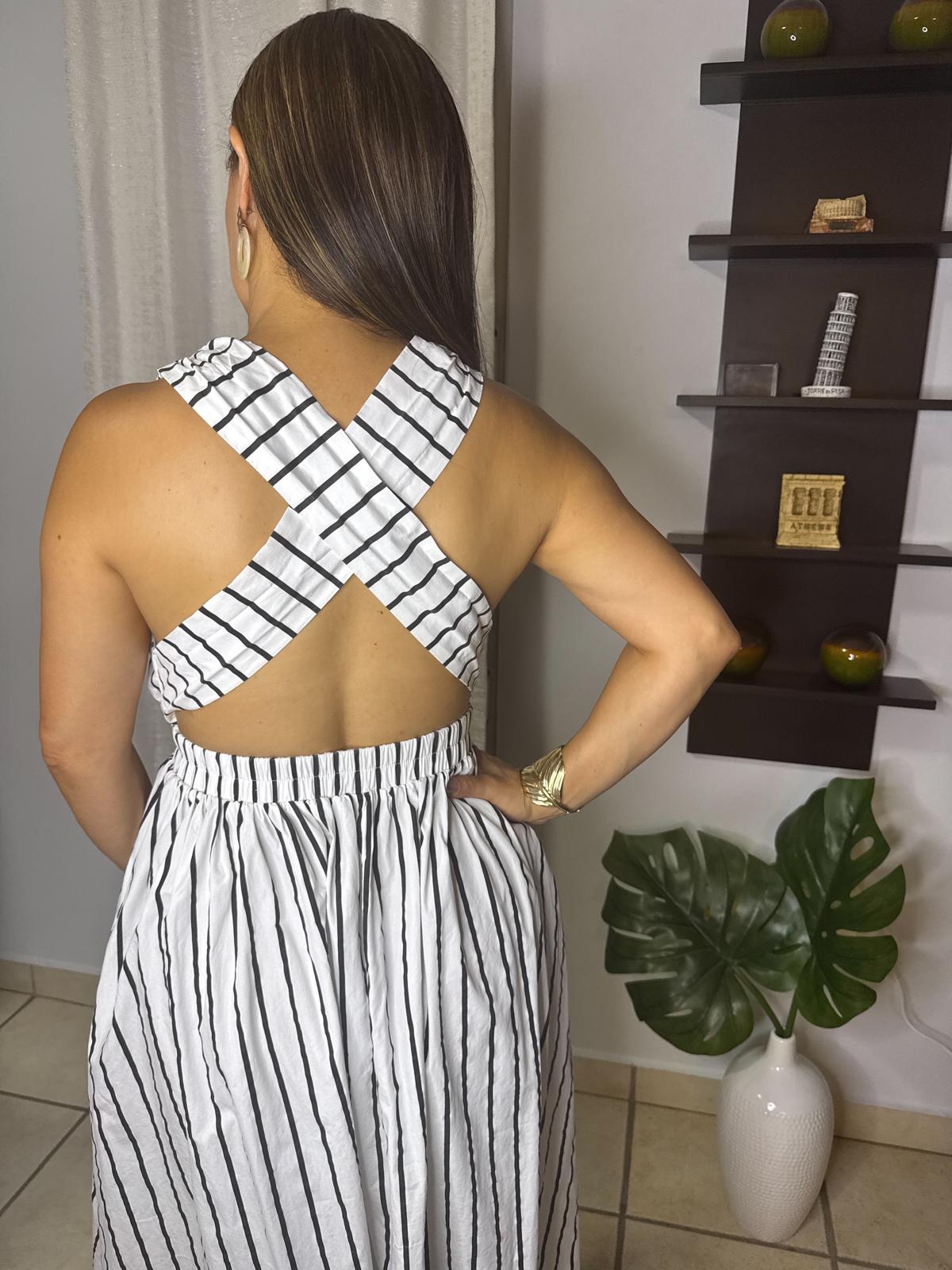 A printed poplinn MIDI dress featuring round neckline, seleves, elasticized waist, full skirt, side pockets and cross back details self. 100% cotton lining: 100% polyester